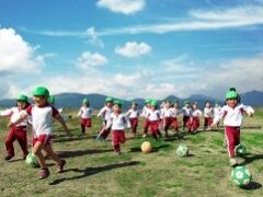 美しい自然に囲まれた広いグラウンドがあり、子どもたちは毎日のびのび保育を楽しんでいます。『遊びのふれあい』『スポーツの楽しさ』を活かしたユニークな幼児教育を実践。高校生や専門学校生との定期的な交流を図るなど情操面・運動面にも力を注ぎ、年間を通してスポーツメニューが盛りだくさんです。